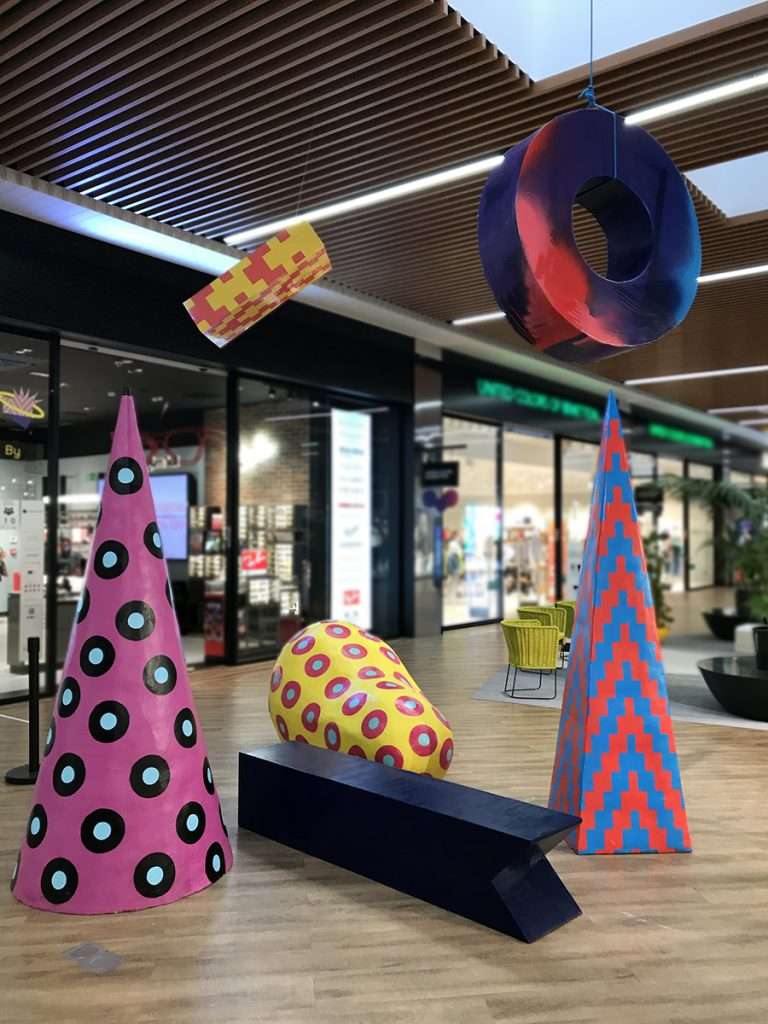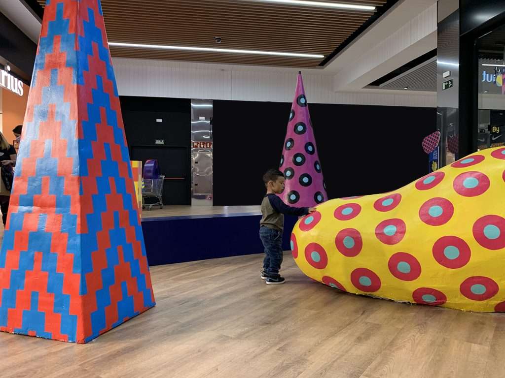 Parte de la colaboración consistía en aplicar ese estilo gráfico al propio espacio. En principio, la propuesta incluía vinilar varios varios escaparates y cerramientos que correspondían a puertas de locales sin uso o zonas de almacén, de manera que pudiéramos dar una imagen más dinámica y completa del centro comercial. Esos vinilos se acabaron convirtiendo en dos murales, una intervención escultórica y una intervención de banderas por todo el espacio. Además de la aplicación de diferentes elementos gráficos extraídos de los diseños para, esta vez sí, vinilar en cristaleras, zonas de paso, etc..